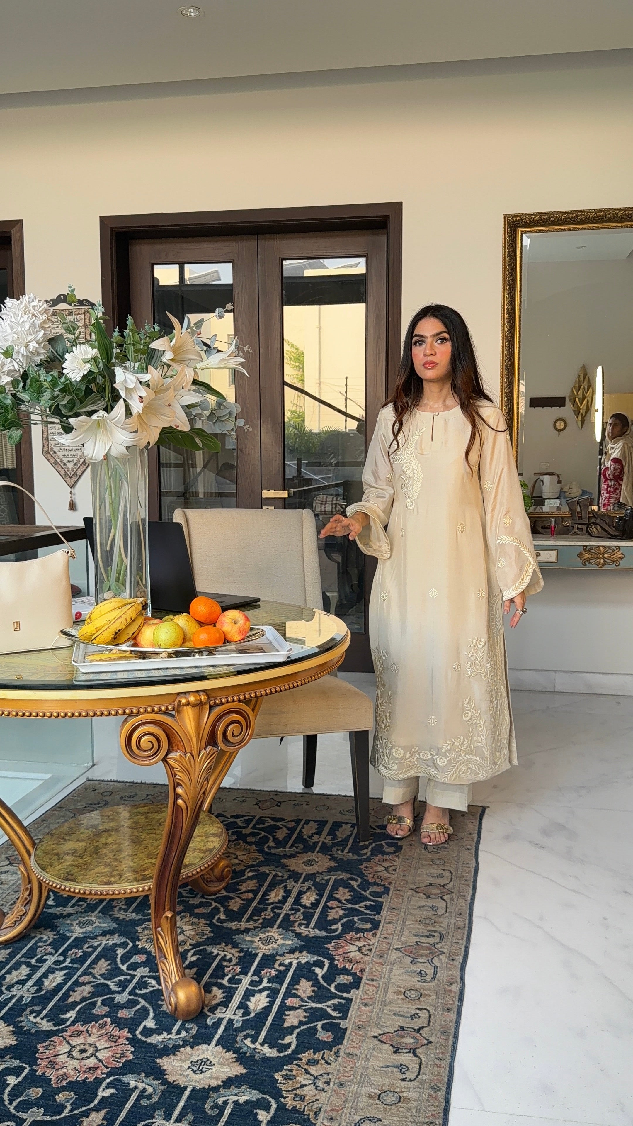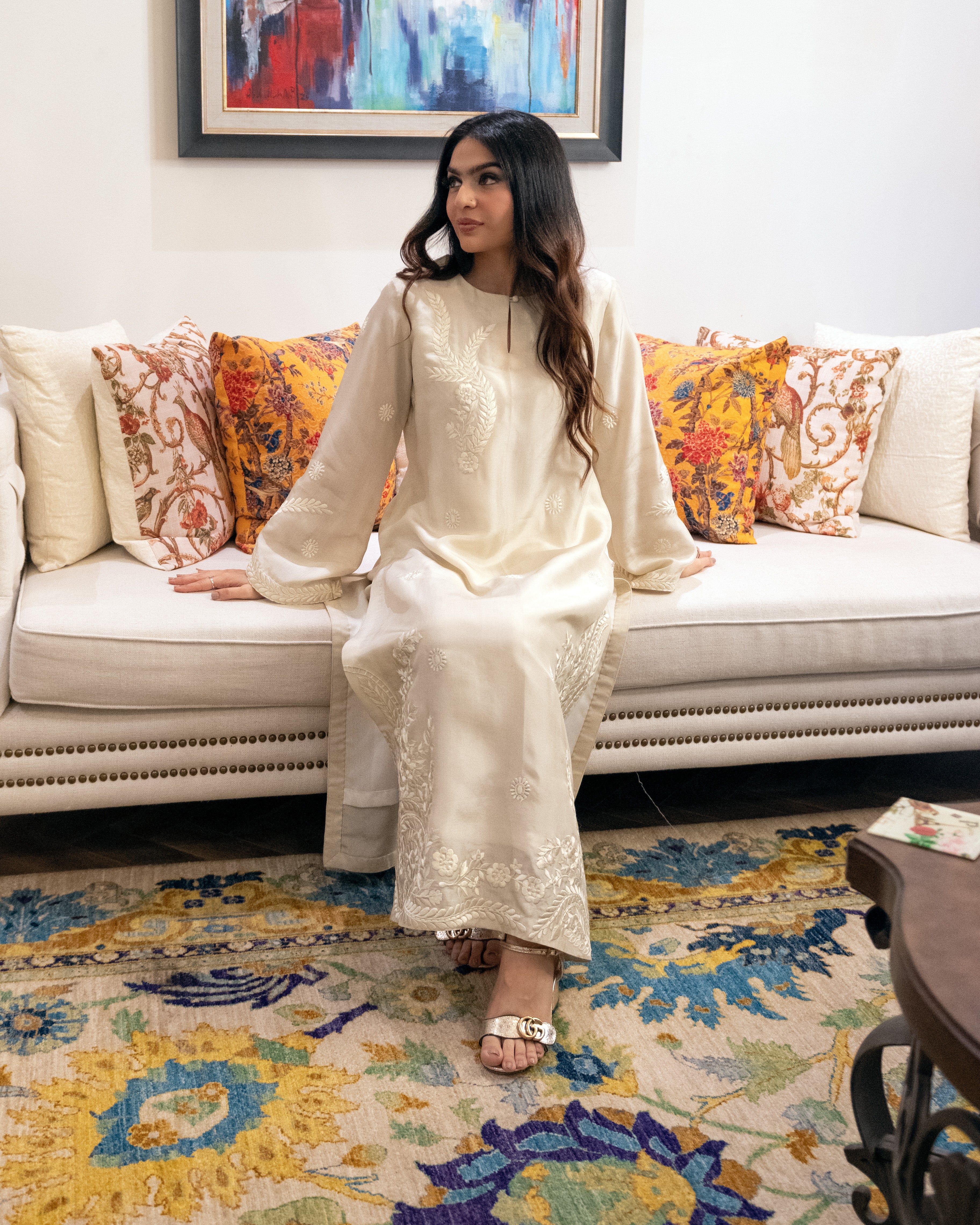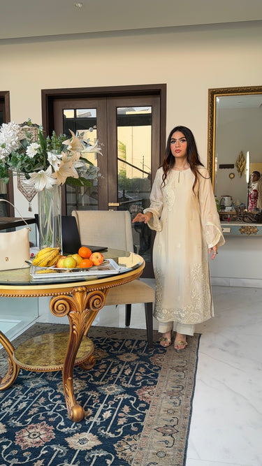 CBR 151 — An off-white silk shirt adorned with delicate pearl work and intricate embroidery on the sleeves, neckline, and daman. Paired beautifully with a matching dupatta for a timeless, graceful look.