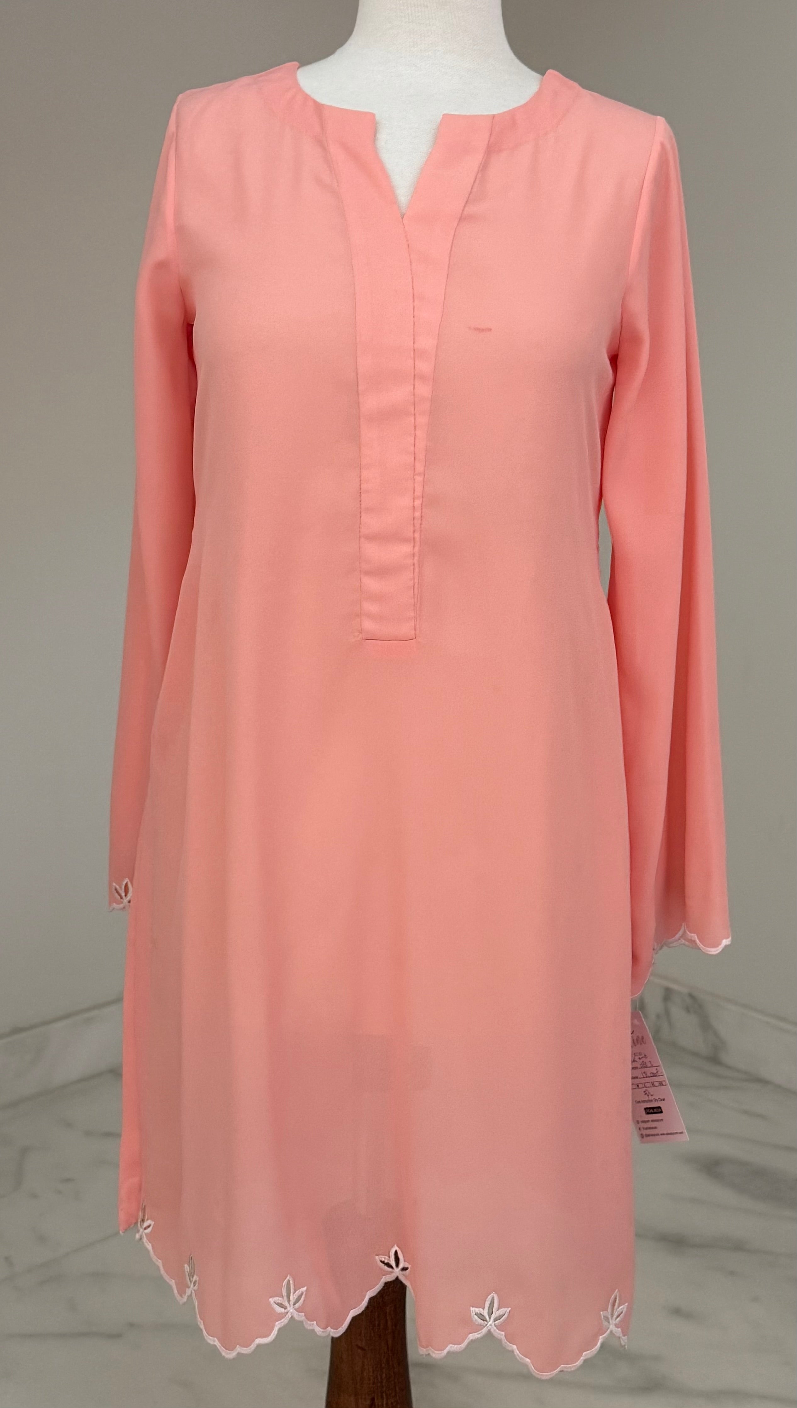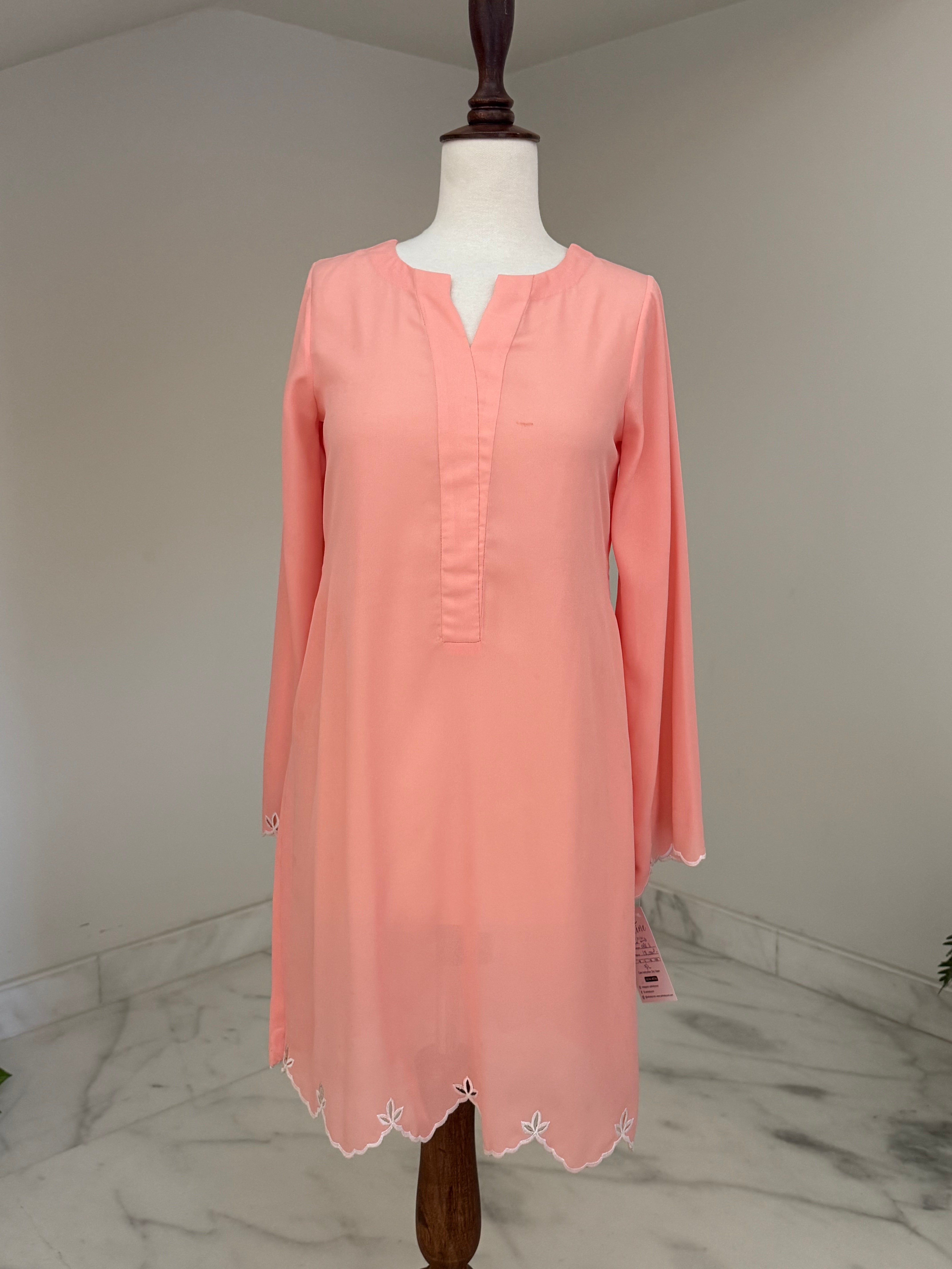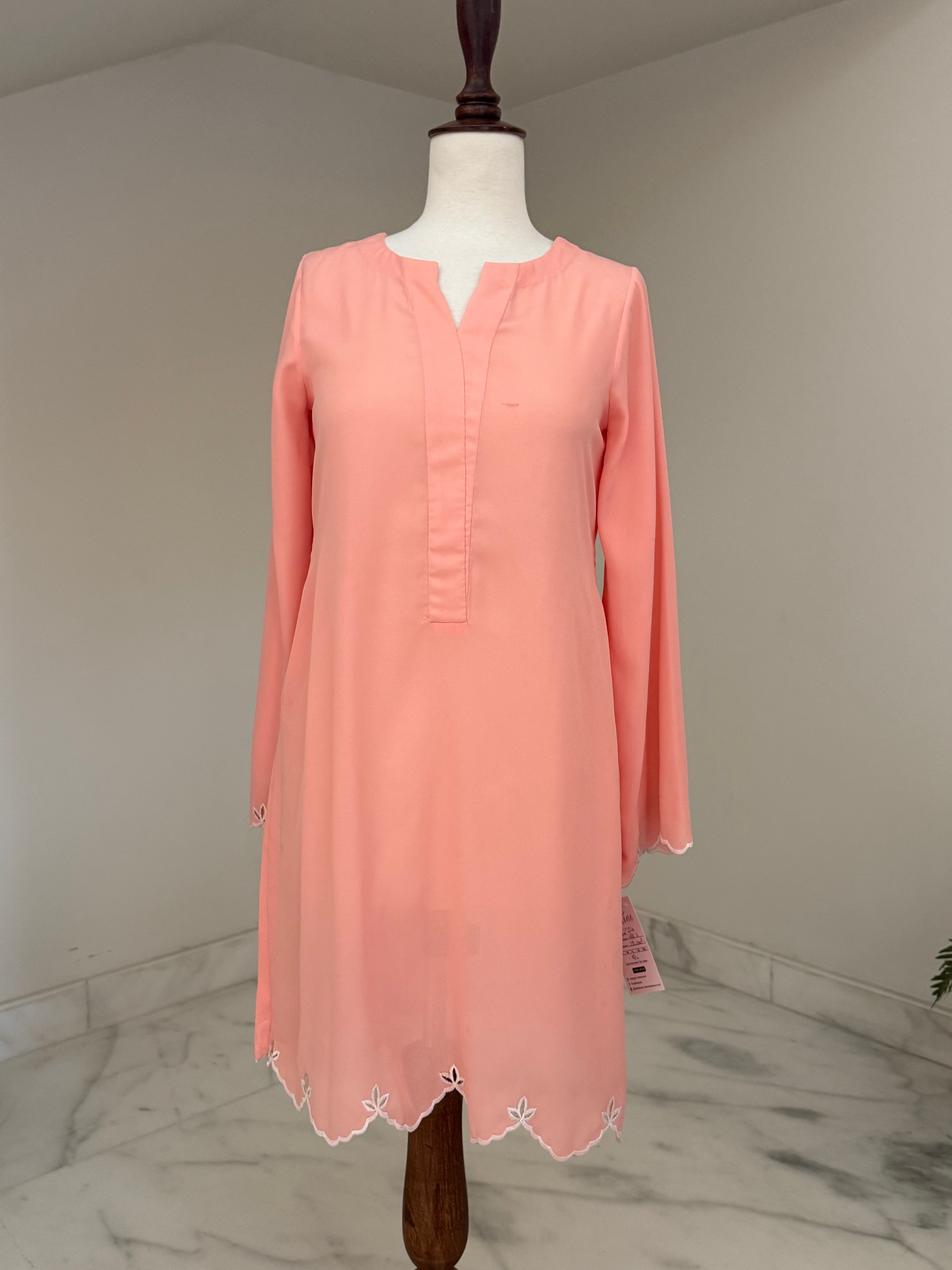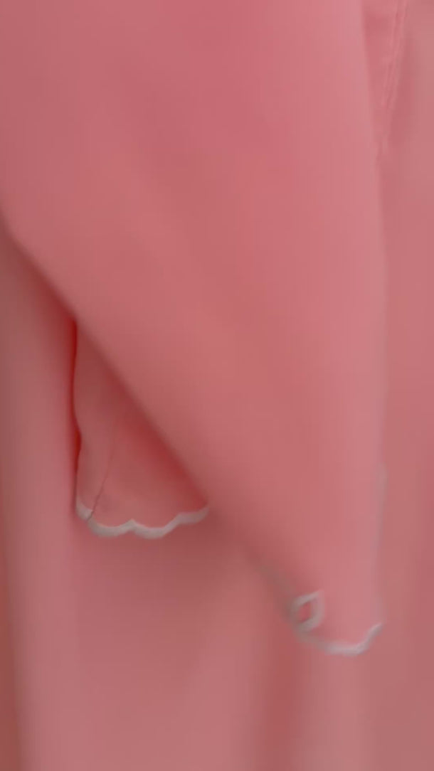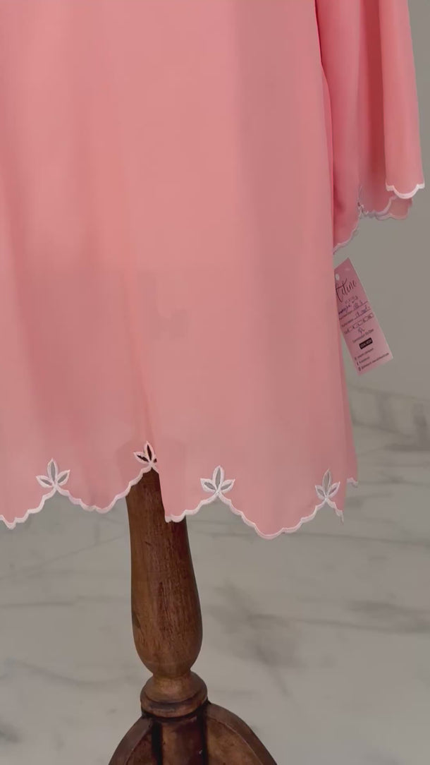 Crafted from luxurious butter georgette, this soft peach two-piece set exudes elegance and simplicity. The shirt features a graceful scalloped hem with delicate white floral embroidery, mirrored on the straight pajama for a harmonious look. The lightweight fabric drapes beautifully, making it perfect for both daytime sophistication and evening grace.