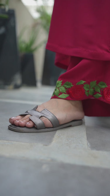 A striking red solid shirt with raw-edged sleeves and a classic kurta neckline, paired with an embroidered pajama adorned with delicate green and red roses — a perfect blend of elegance and charm.
