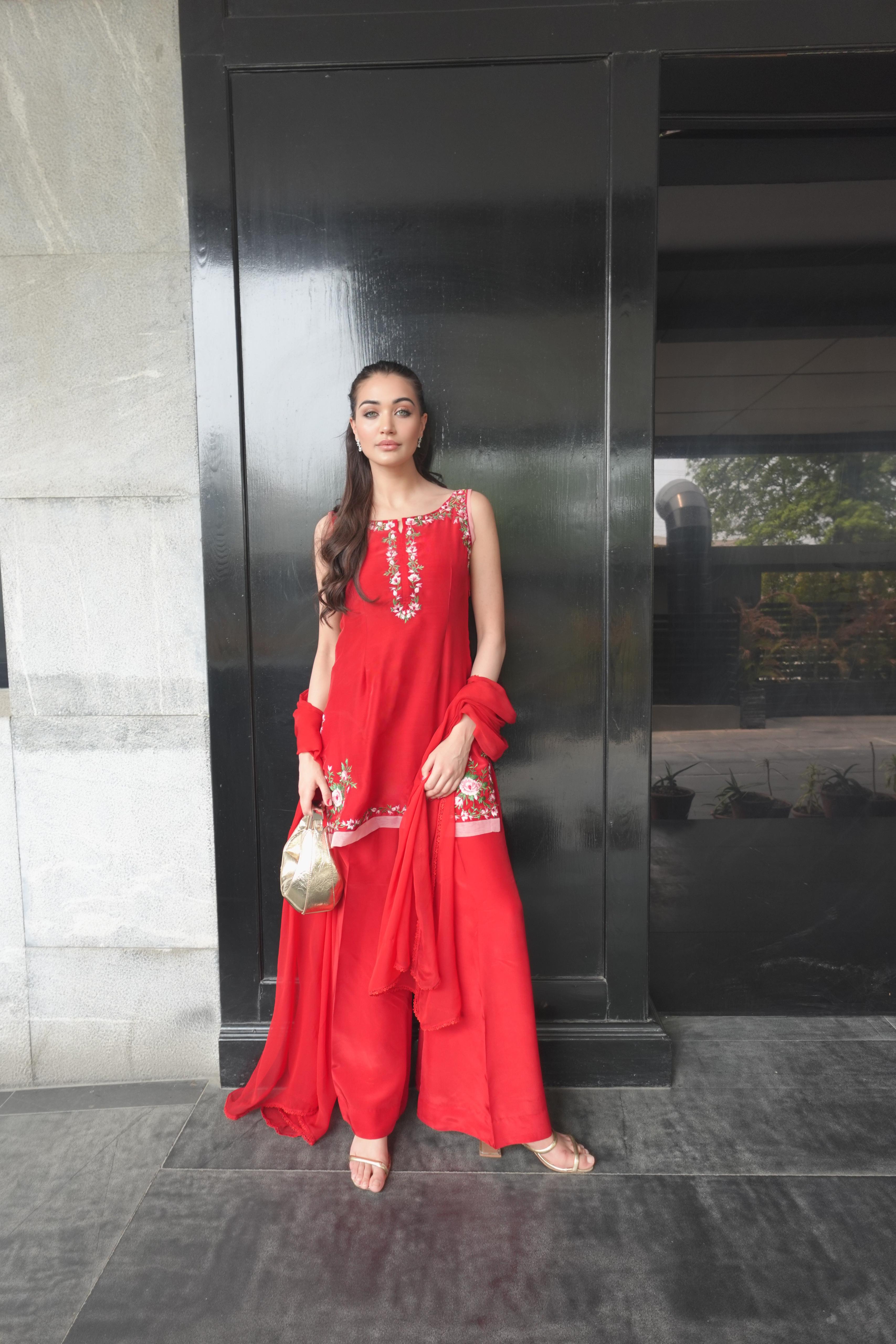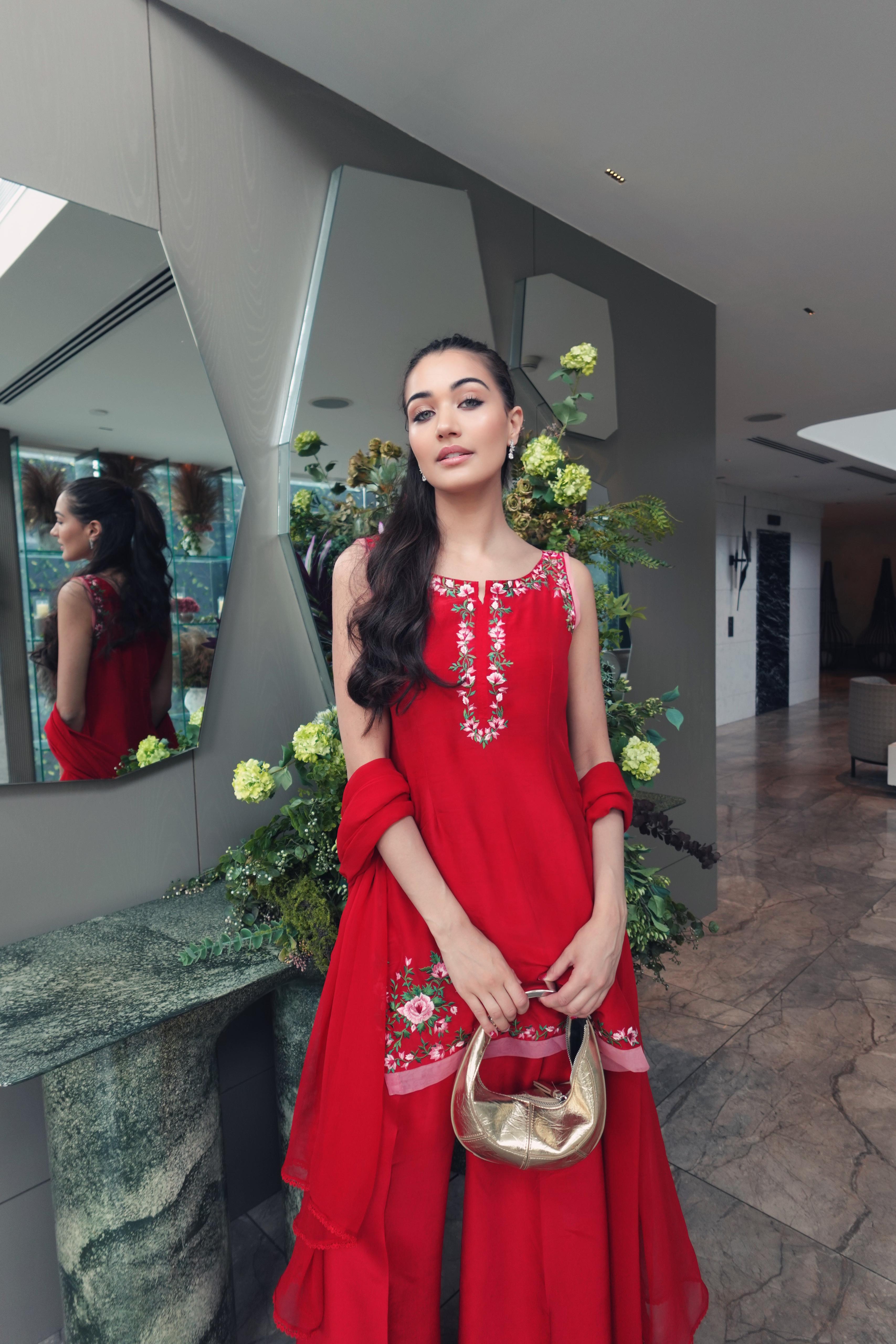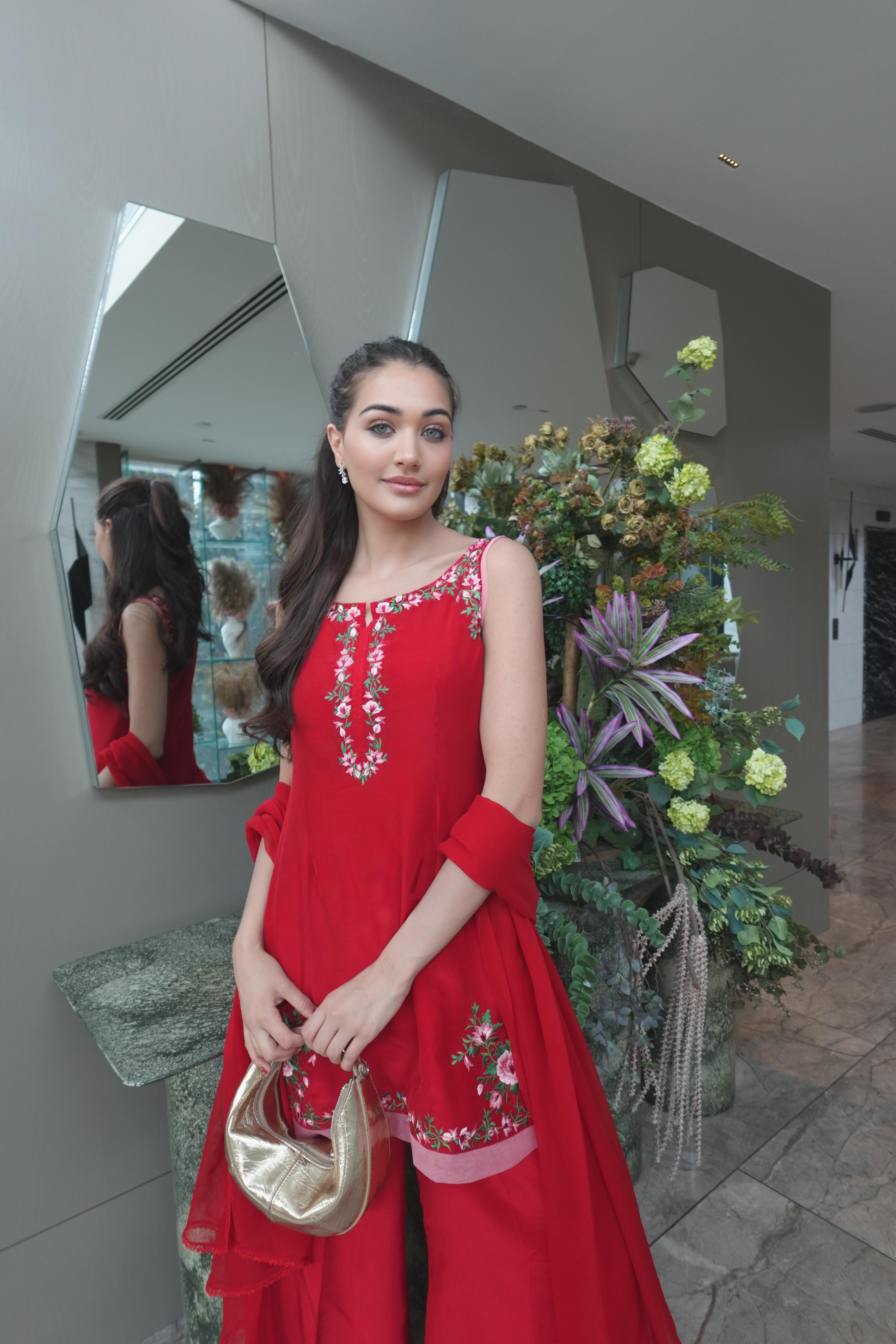 A timeless red ensemble crafted in classic tussar silk, adorned with delicate shaded pink floral embroidery along the daman, chak, and neckline—adding a soft, feminine charm. Paired with a plain wide-legged pajama and a flowing chiffon dupatta, this elegant 3-piece is perfect for Eid celebrations. The short shirt is available with or without sleeves and can also be customised in luxurious raw silk.