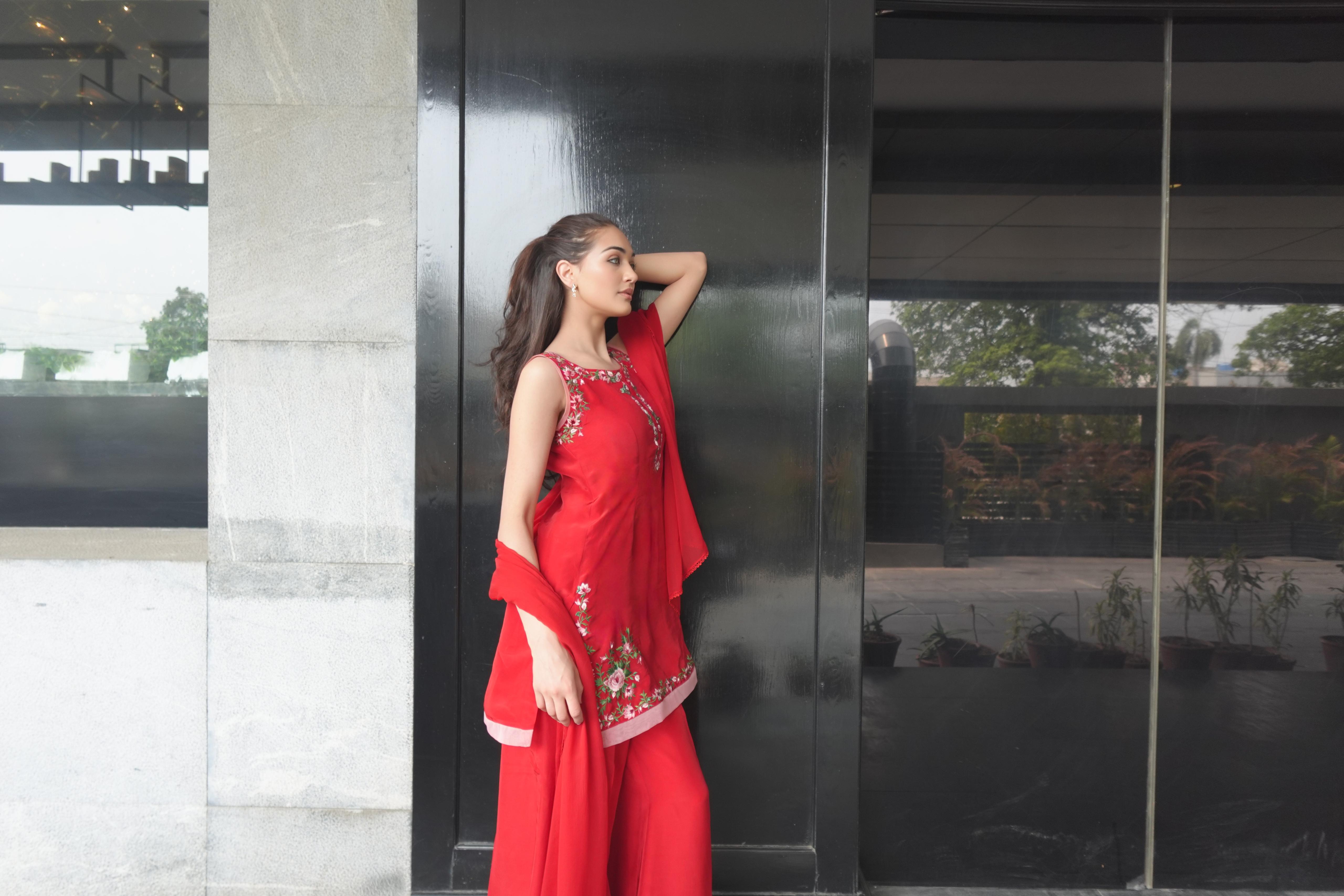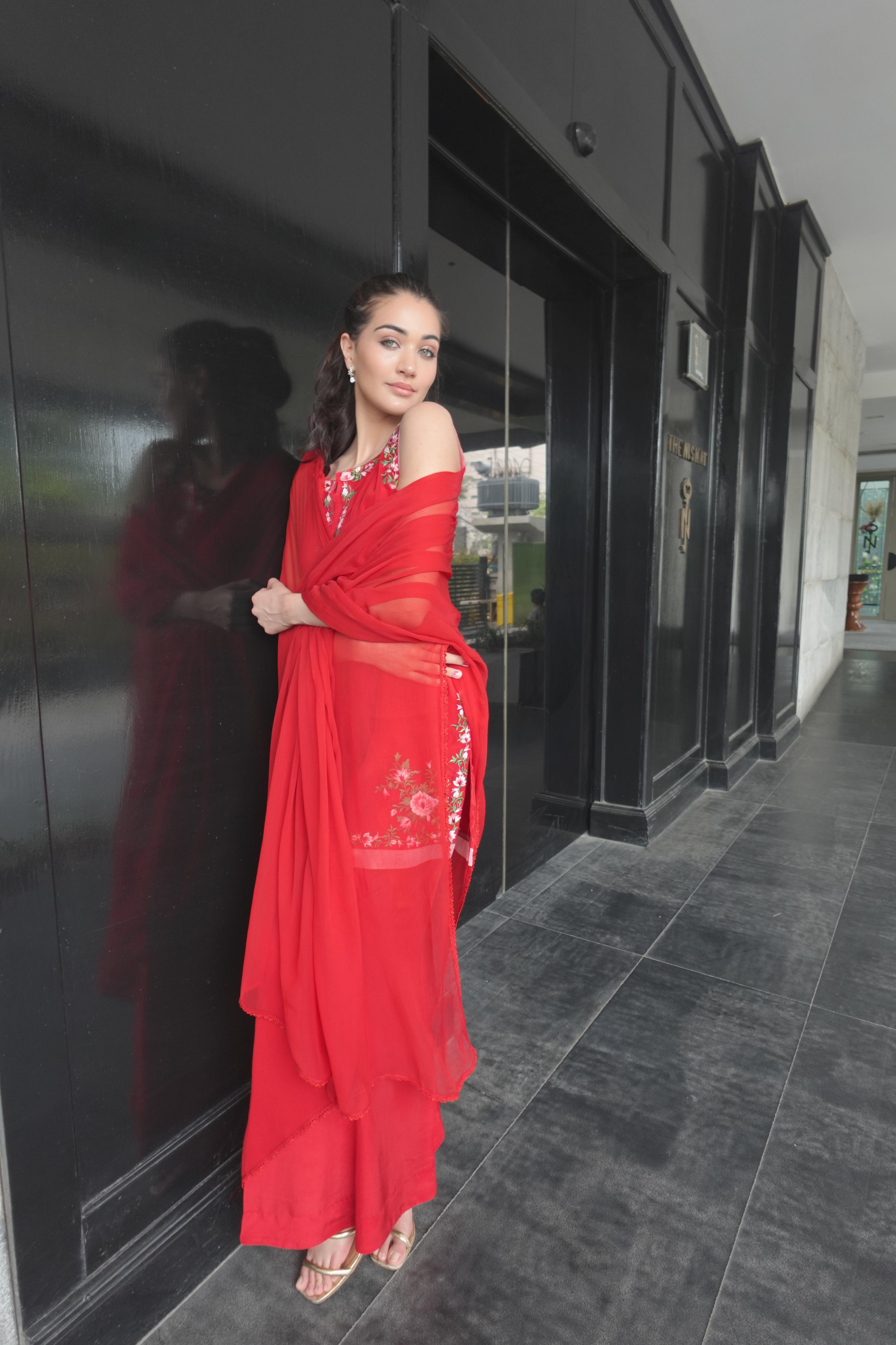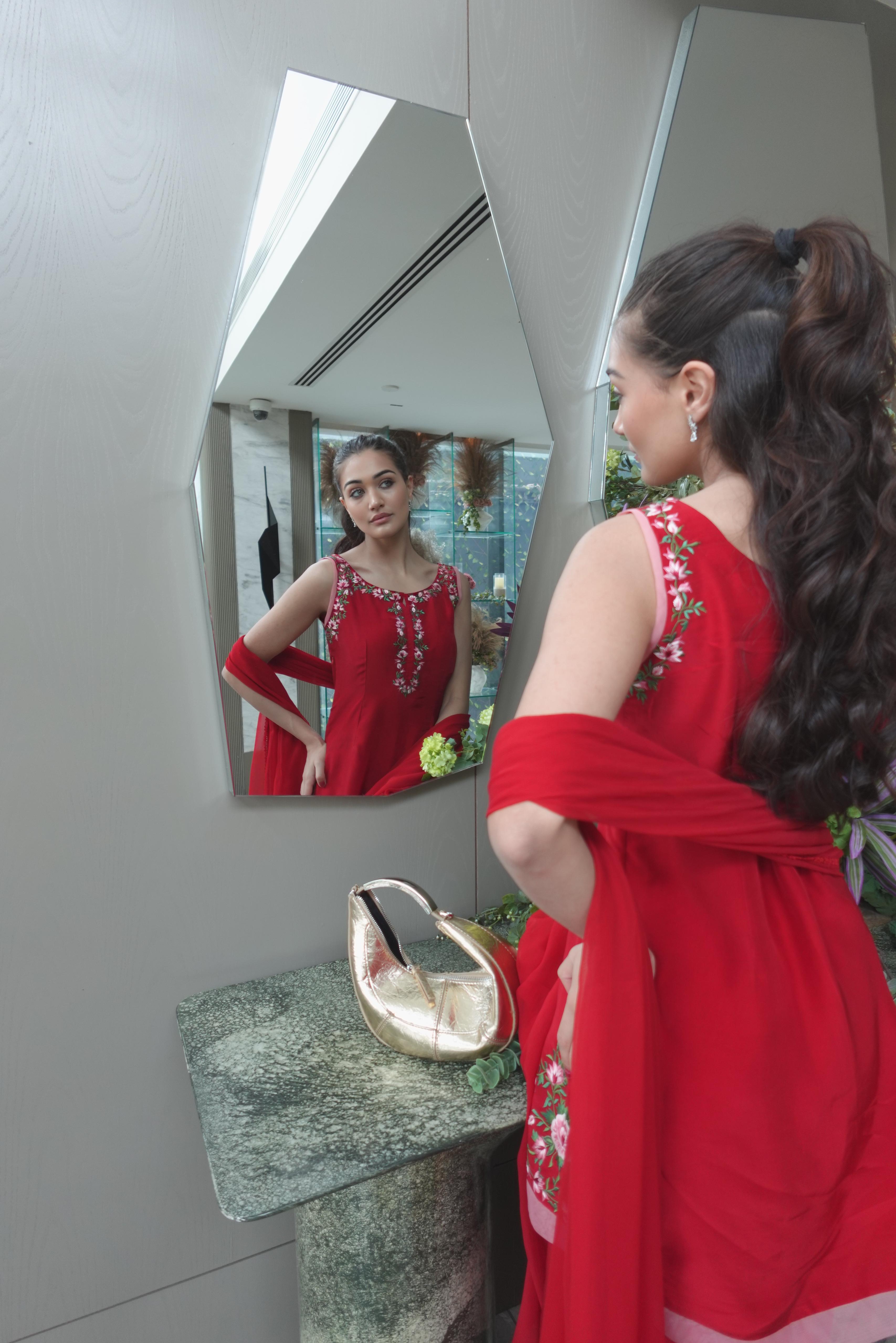 A timeless red ensemble crafted in classic tussar silk, adorned with delicate shaded pink floral embroidery along the daman, chak, and neckline—adding a soft, feminine charm. Paired with a plain wide-legged pajama and a flowing chiffon dupatta, this elegant 3-piece is perfect for Eid celebrations. The short shirt is available with or without sleeves and can also be customised in luxurious raw silk.
