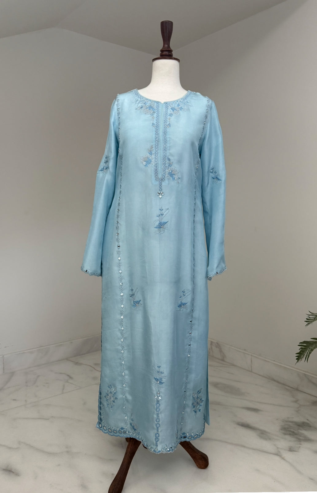 Grace meets finesse in Nehrin, a soft sky blue 3-piece ensemble crafted from premium tussle silk. The shirt features intricate mirror work and delicate embroidery, beautifully complemented by cutwork chaks and a richly detailed ghaira in shades of sky blue and peach. Paired with a flowing chiffon dupatta, this outfit radiates elegance — a perfect pick for daytime festivities or graceful evening gatherings.