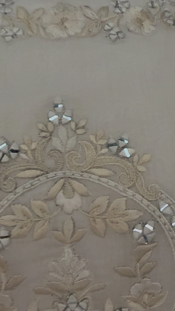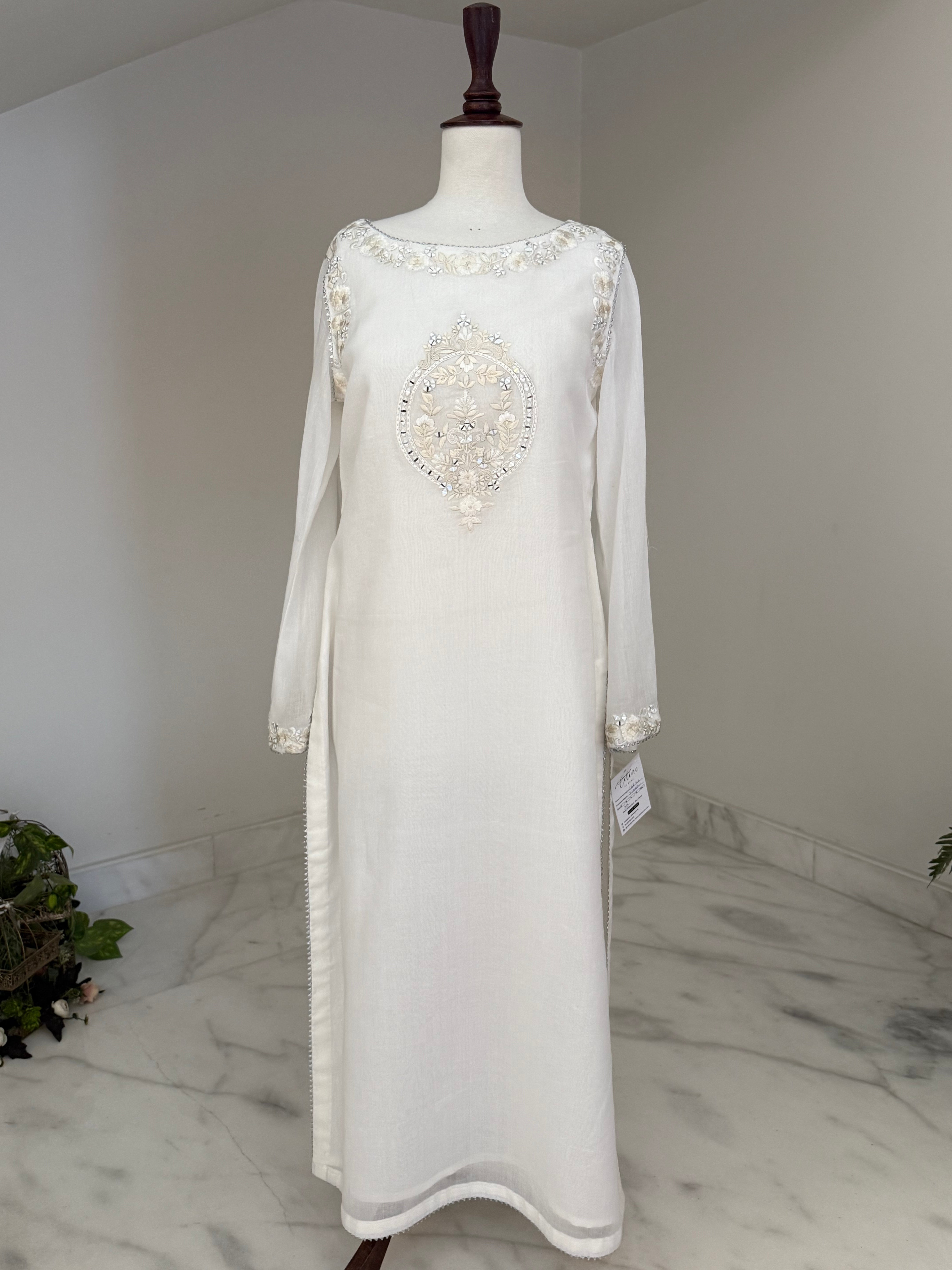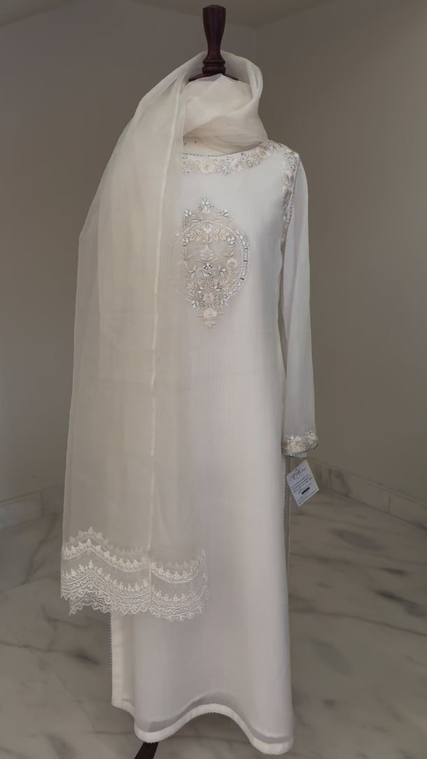 Step into timeless grace with Noor-e-Safa, a pristine white paper lawn shirt adorned with delicate embroidery and subtle mirror work along the neckline, adding just the right touch of shimmer. Paired with an ethereal organza dupatta featuring elegant cutwork and finished pallus, this ensemble blends sophistication with a soft, airy charm — perfect for summer soirées or Eid celebrations.