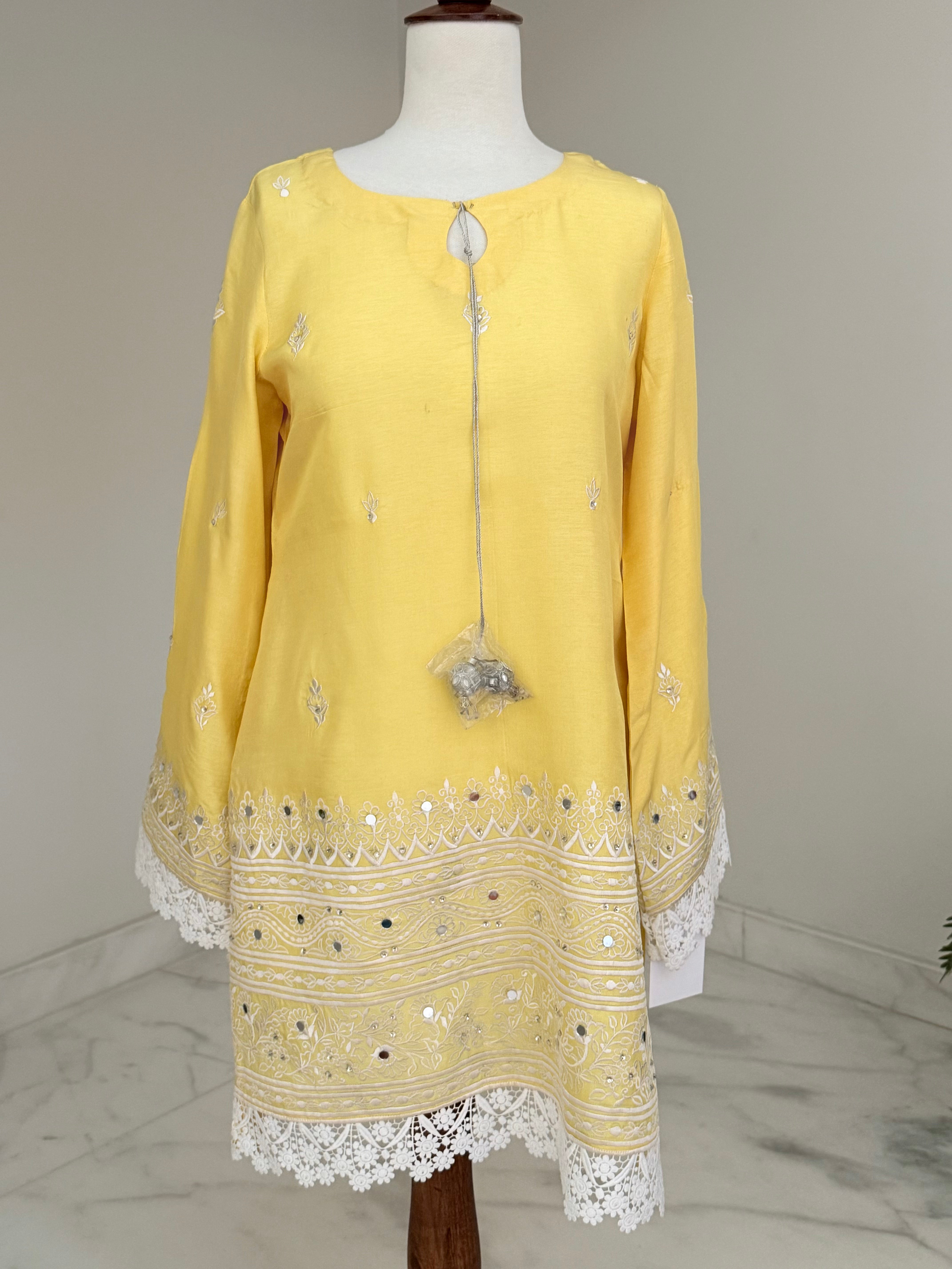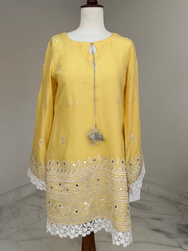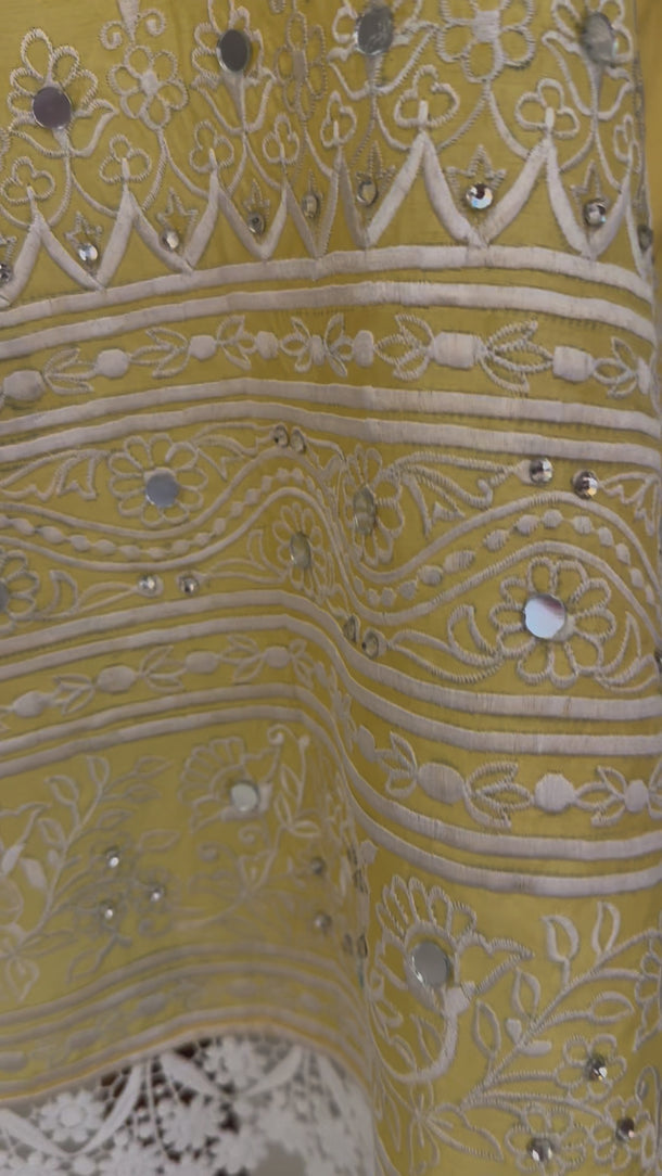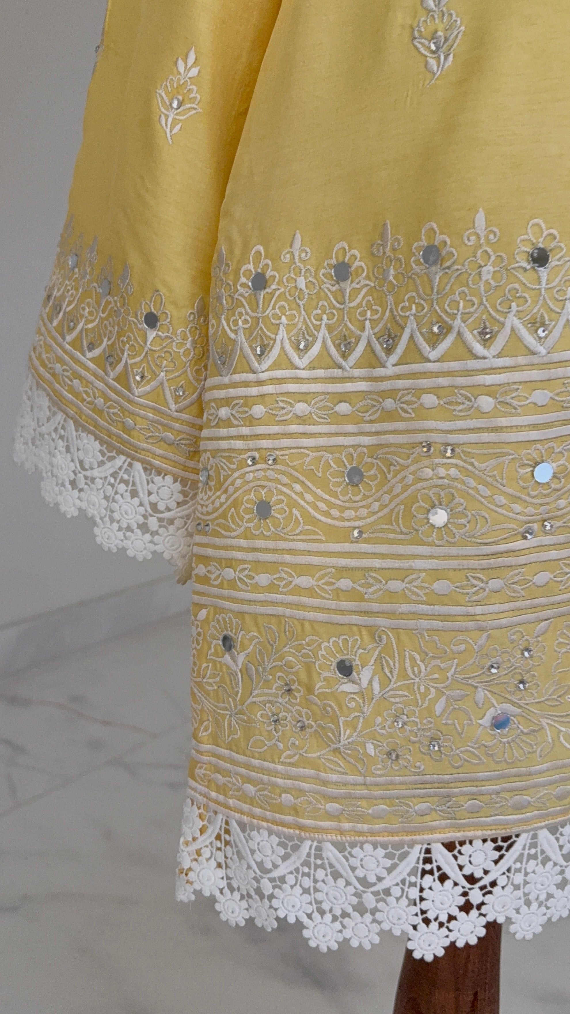 A vibrant celebration of tradition and elegance, Zeenat-e-Bahar features a yellow tussle silk short shirt adorned with delicate white embroidery on the daman and sleeves, accented with scattered chata work, shimmering mirrors, and sparkling diamantés. Paired with a classic farshi shalwar and a lightweight chiffon dupatta, this 3-piece ensemble is a perfect blend of festive charm and timeless style.