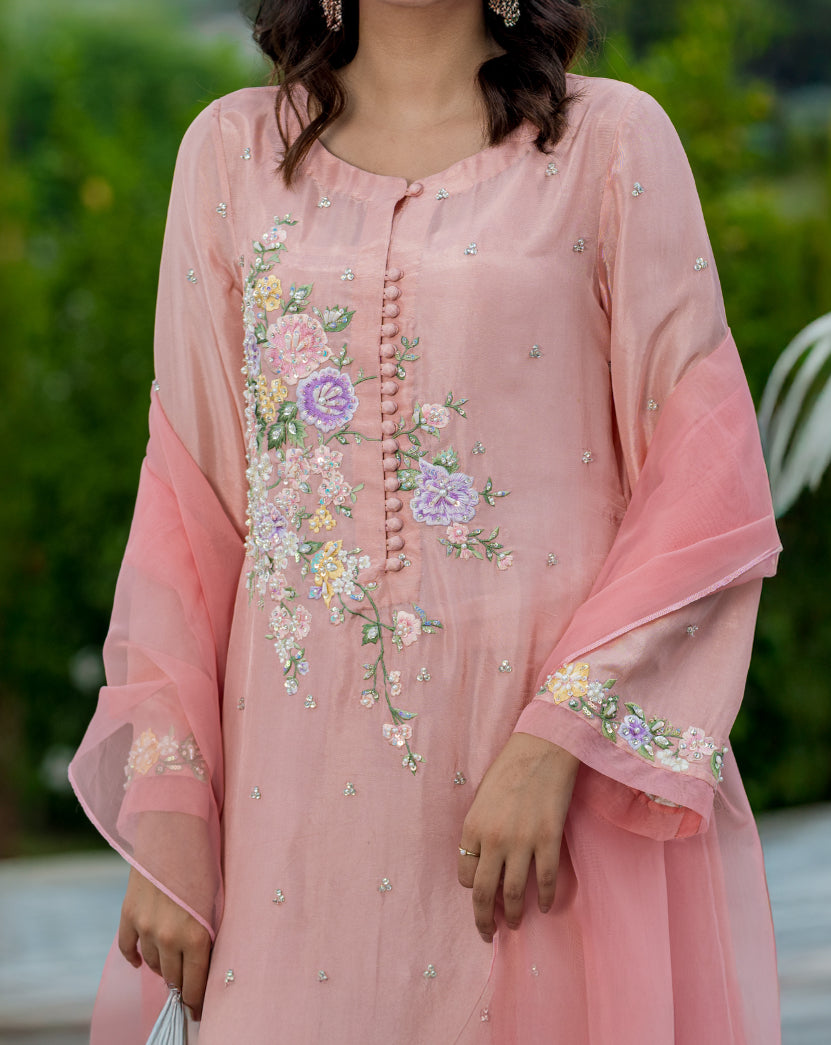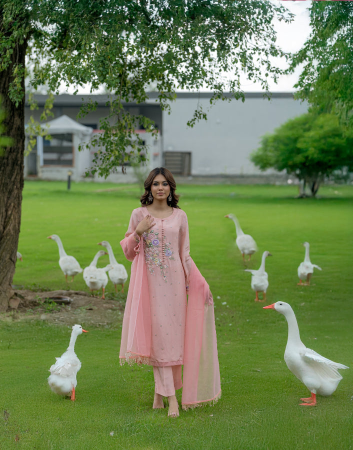 Blush Bloom is a graceful three-piece ensemble featuring a long silk shirt delicately embroidered on the front and sleeves, adorned with subtle embellishments for an elegant touch. Paired with a straight pajama and a soft organza dupatta finished with lace detailing on the pallus, this outfit brings timeless sophistication to your wardrobe. Perfect for semi-formal gatherings and summer soirées.