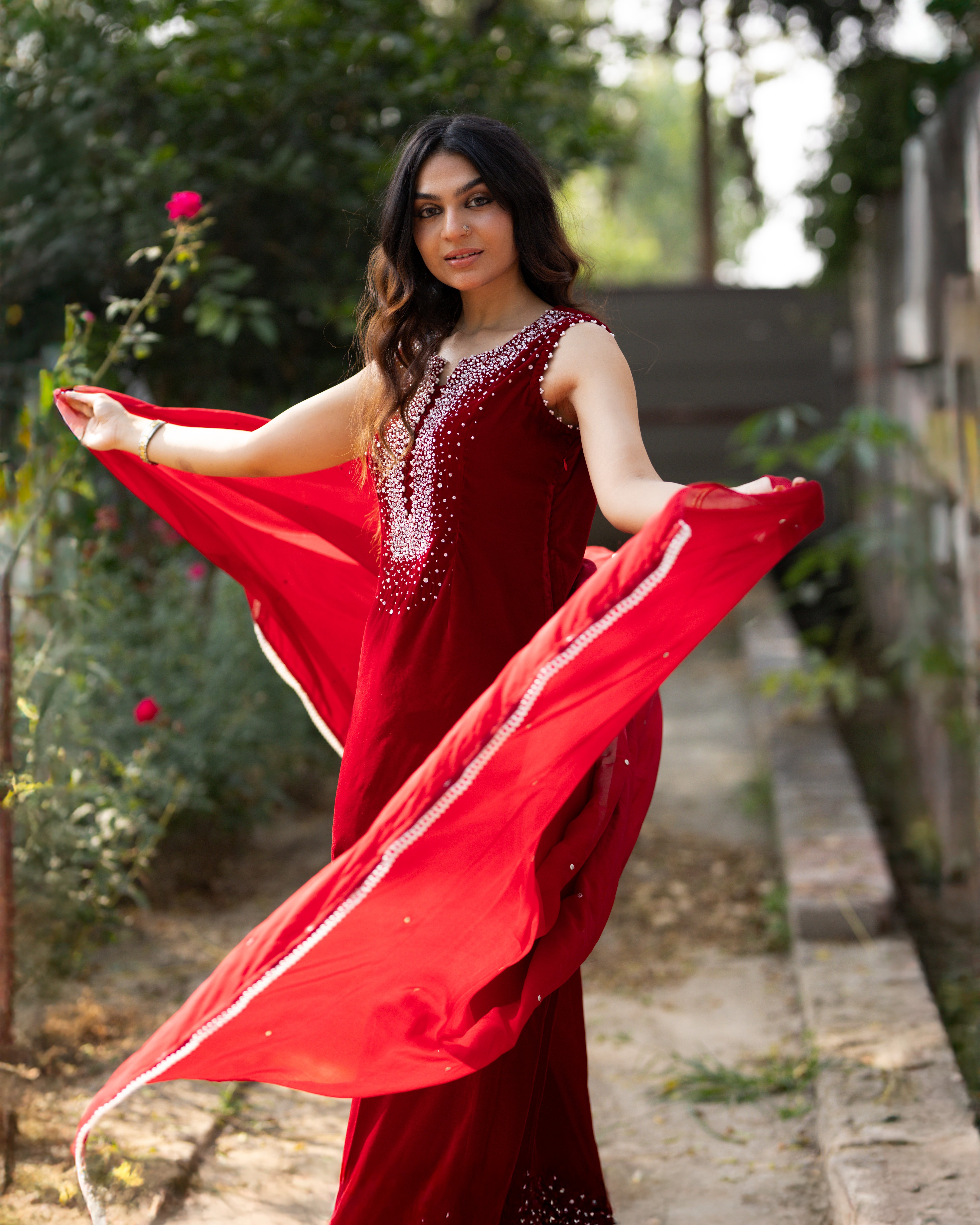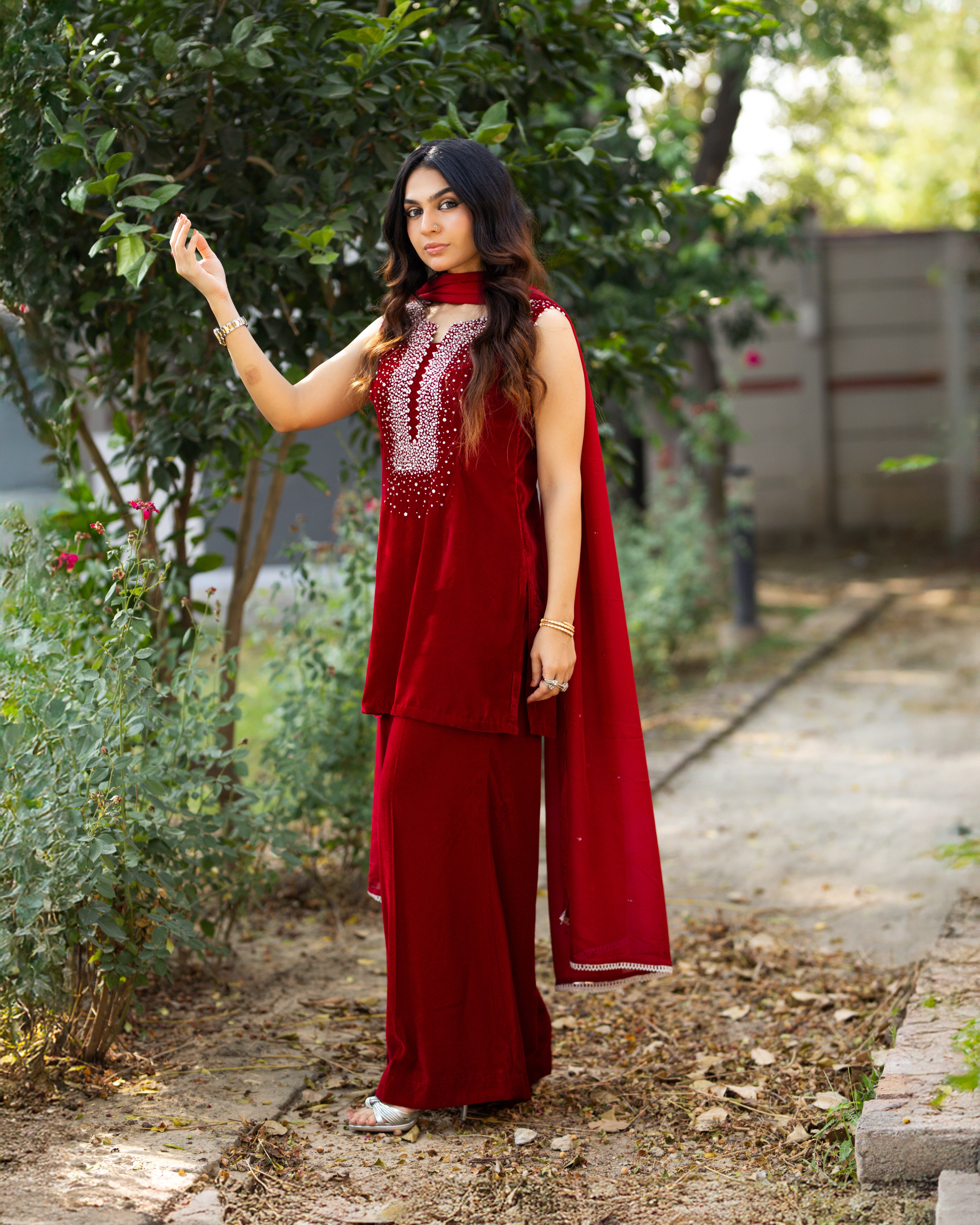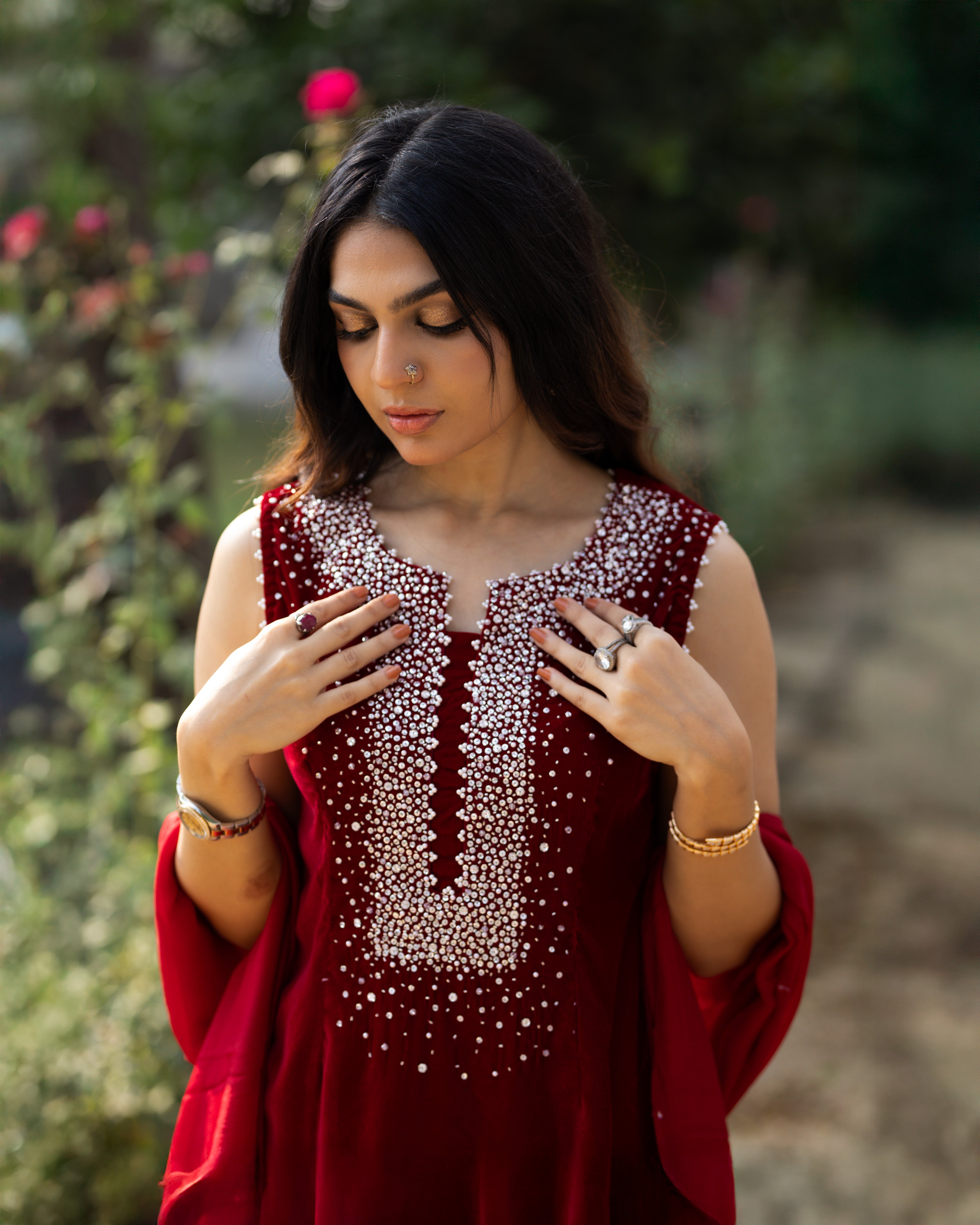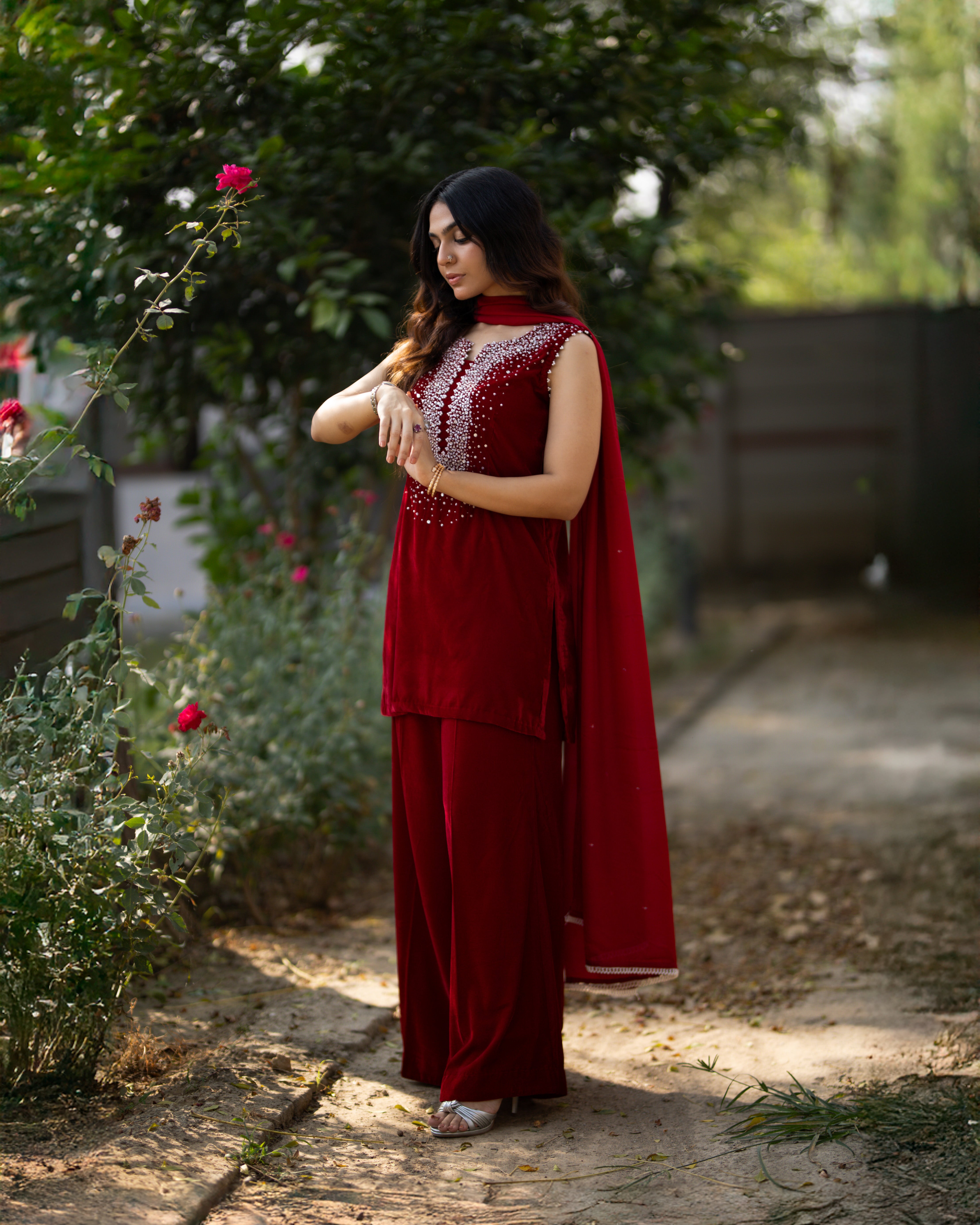 CBR 227 — a striking red velvet ensemble adorned with diamonties on the neckline, paired with an embellished velvet pajama and a silk dupatta beautifully detailed with sequins.