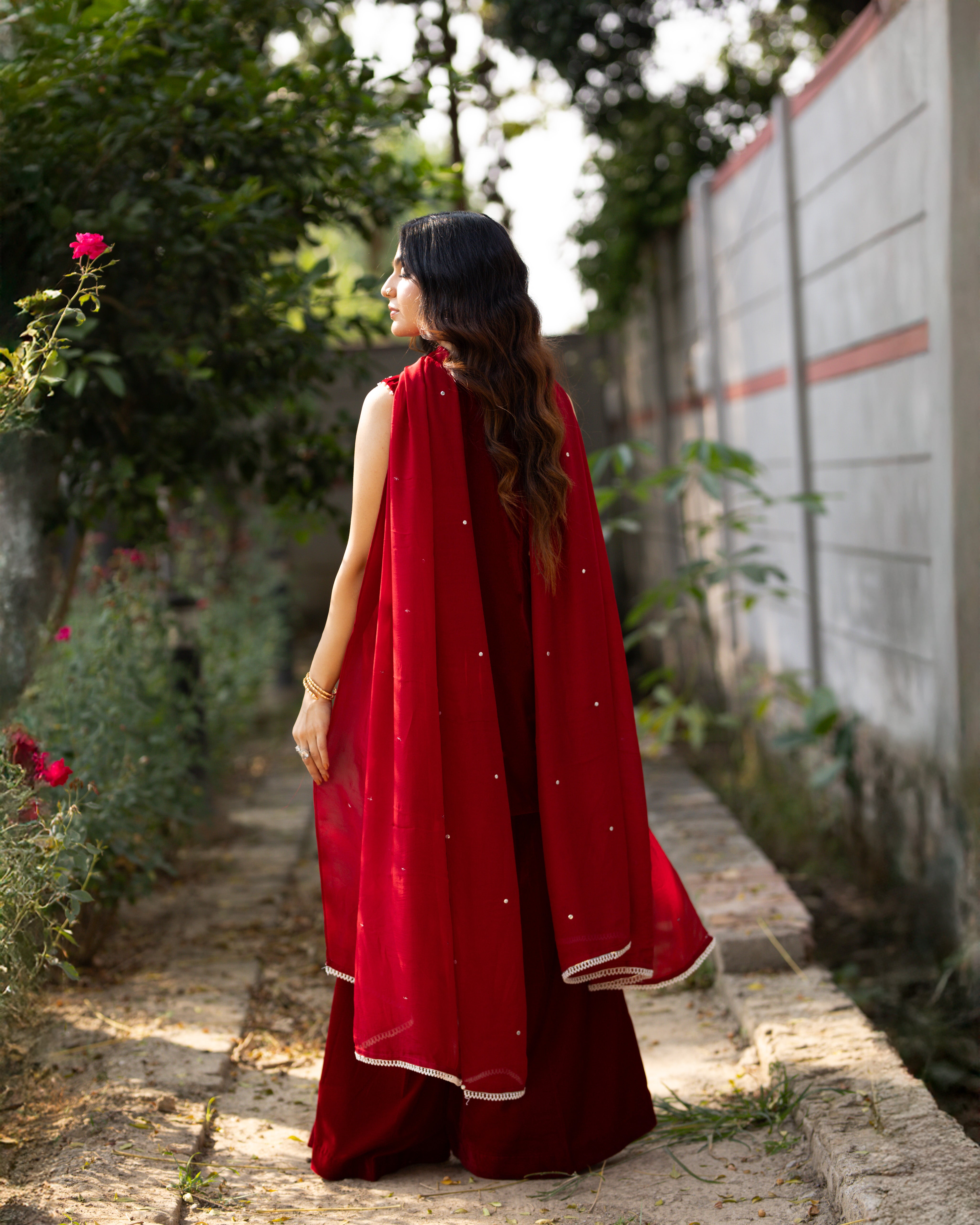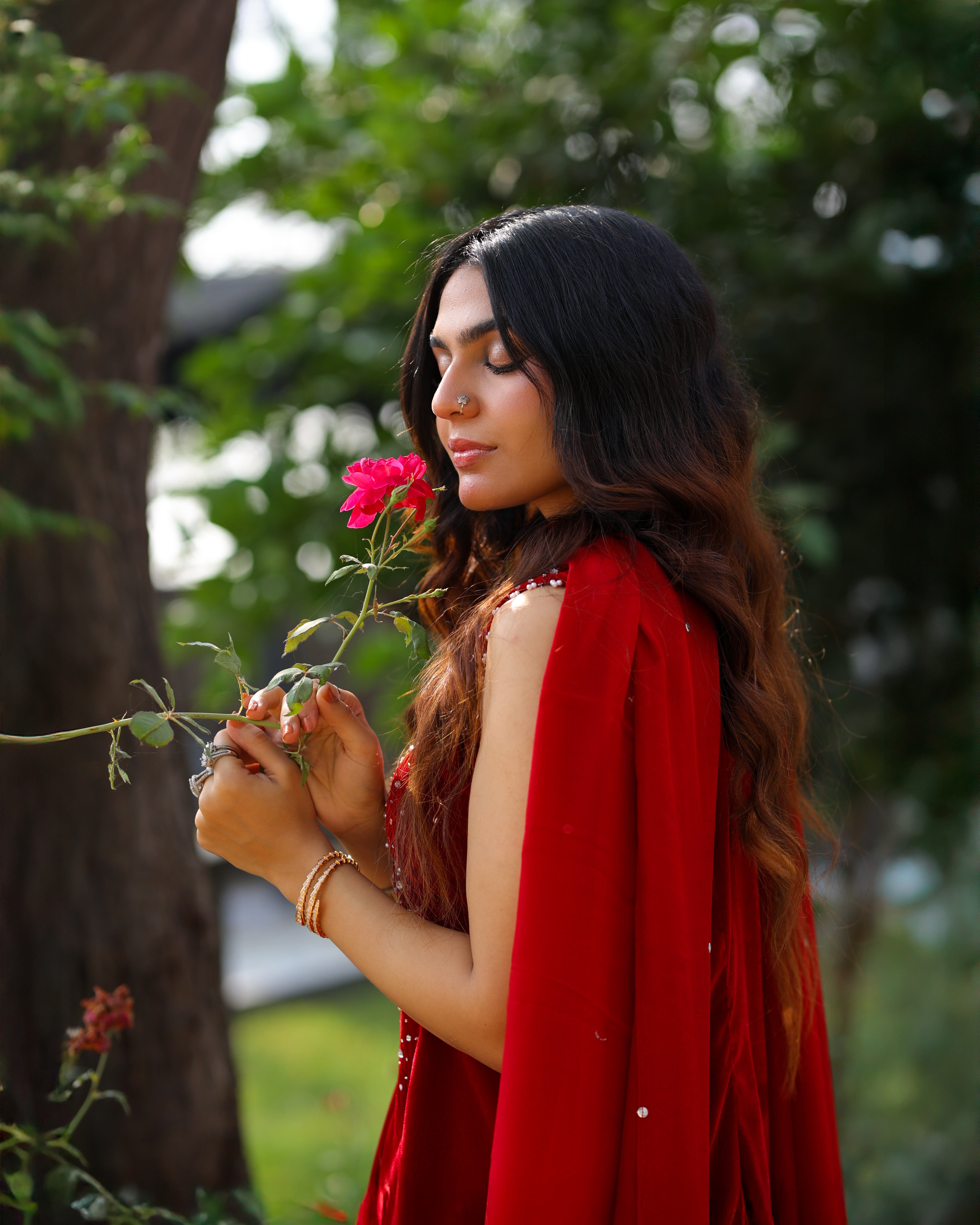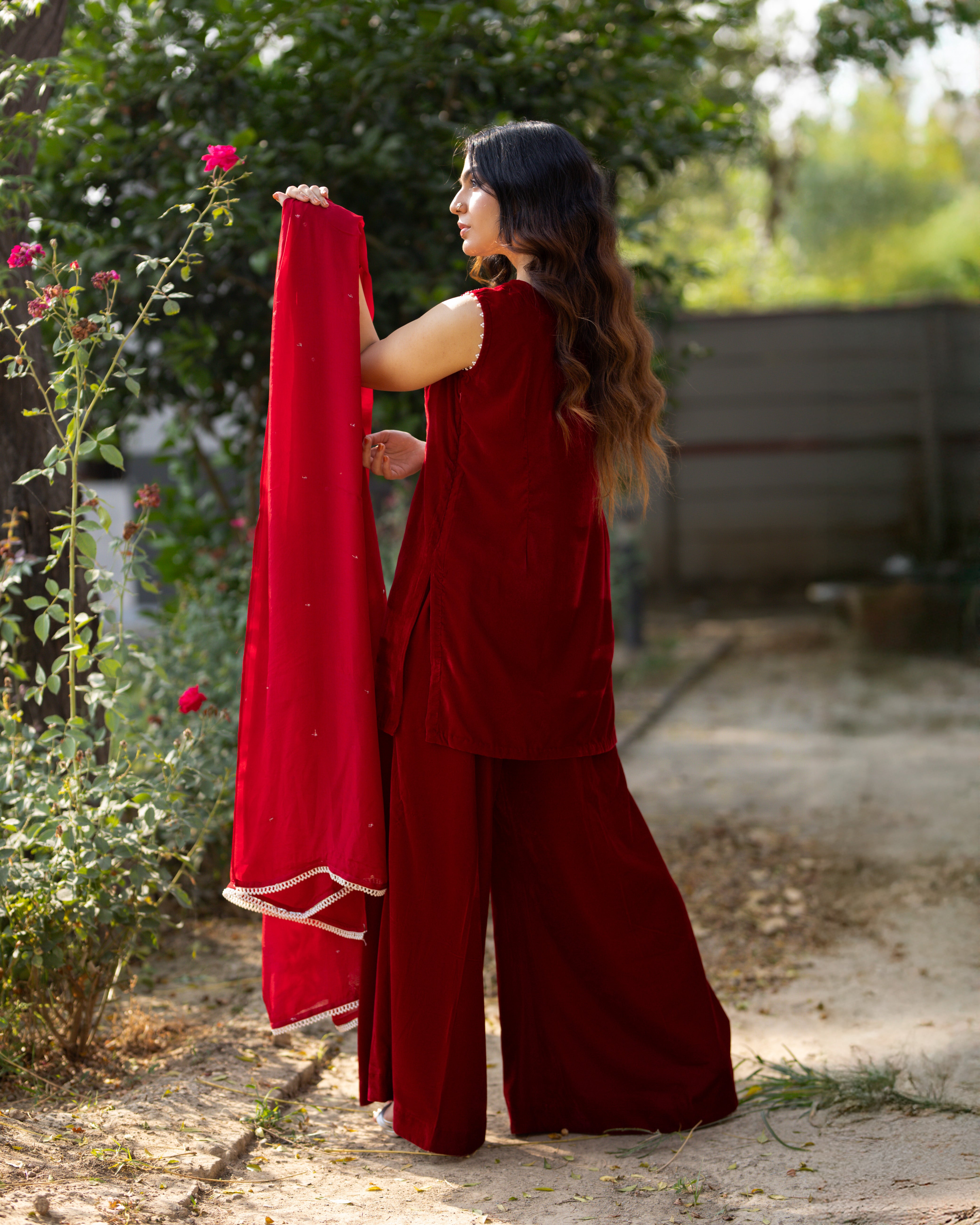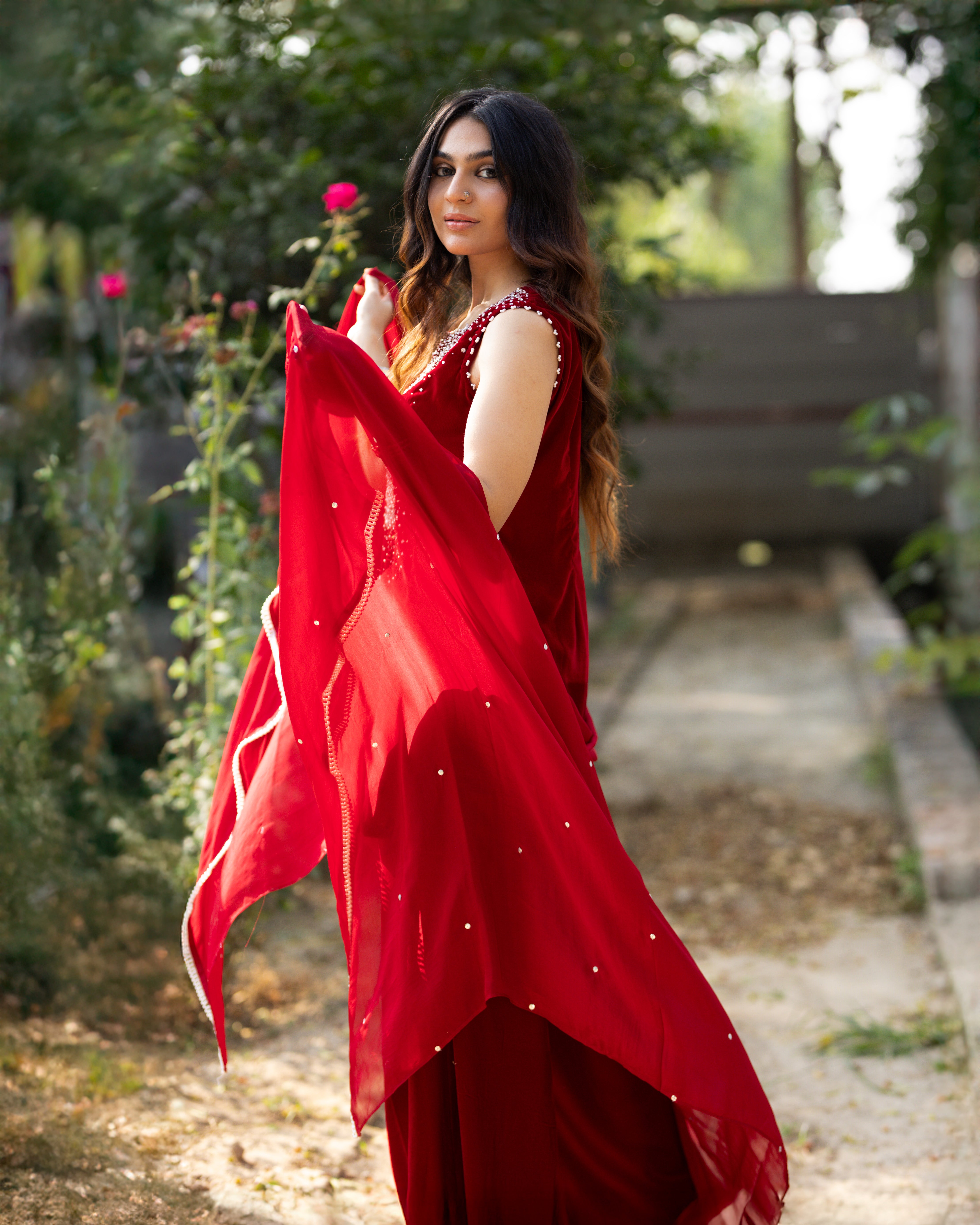 CBR 227 — a striking red velvet ensemble adorned with diamonties on the neckline, paired with an embellished velvet pajama and a silk dupatta beautifully detailed with sequins.