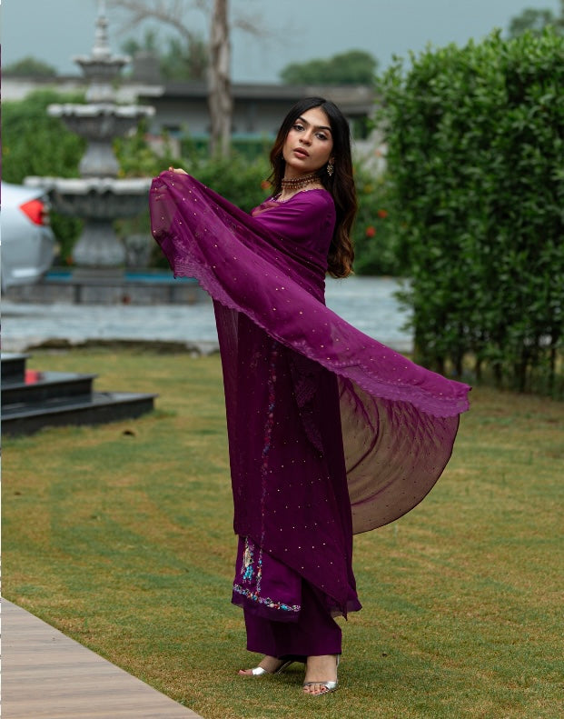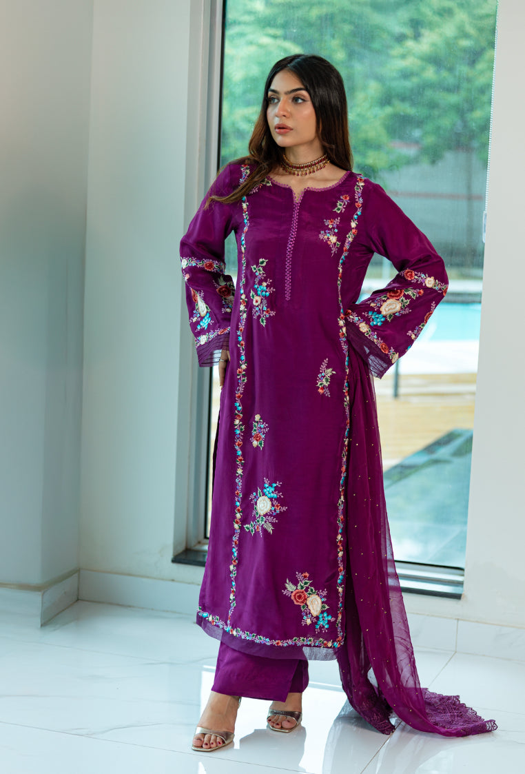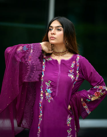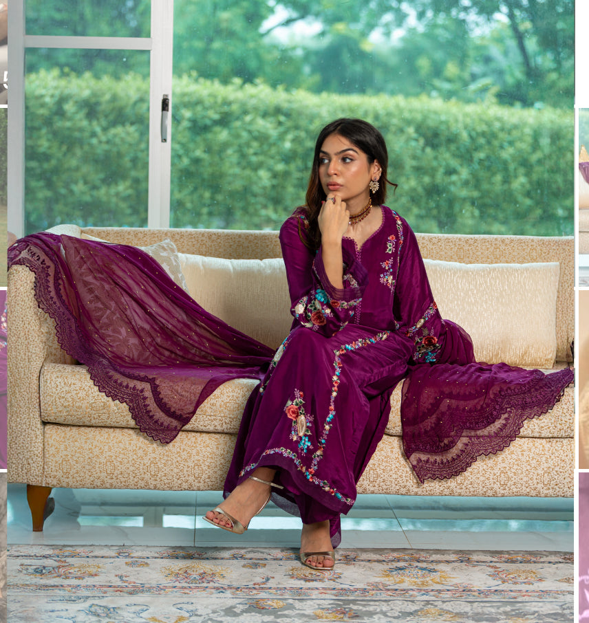 ✨ Elevate your festive style with this stunning silk ensemble adorned with vibrant multi-color embroidery. Paired with a Mukesh chiffon dupatta and finished with delicate embroidered laces on the pallus, this outfit is the perfect blend of elegance and charm. ✨